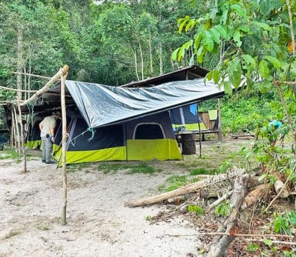 As night fell and we got closer to our camp, we could see lights ahead perched on top of a thirty-foot embankment. After a quick bite and a shot of rum, we were taken to our sleeping area, which consisted of shared tents with mattresses on wooded floors, but each mattress had its own mosquito net.