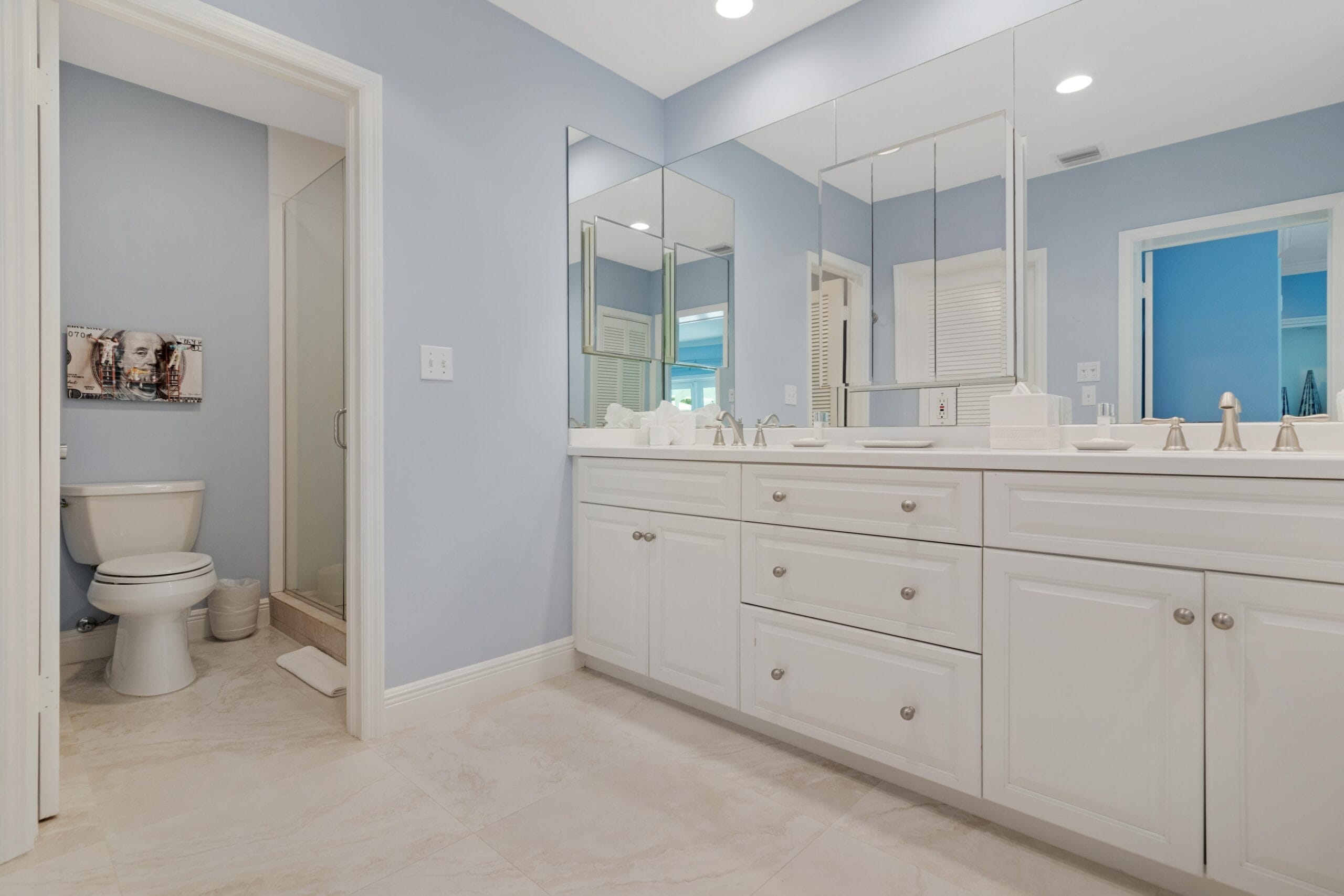 - Master Bedroom: King Bed. The private bathroom has a walk-in shower