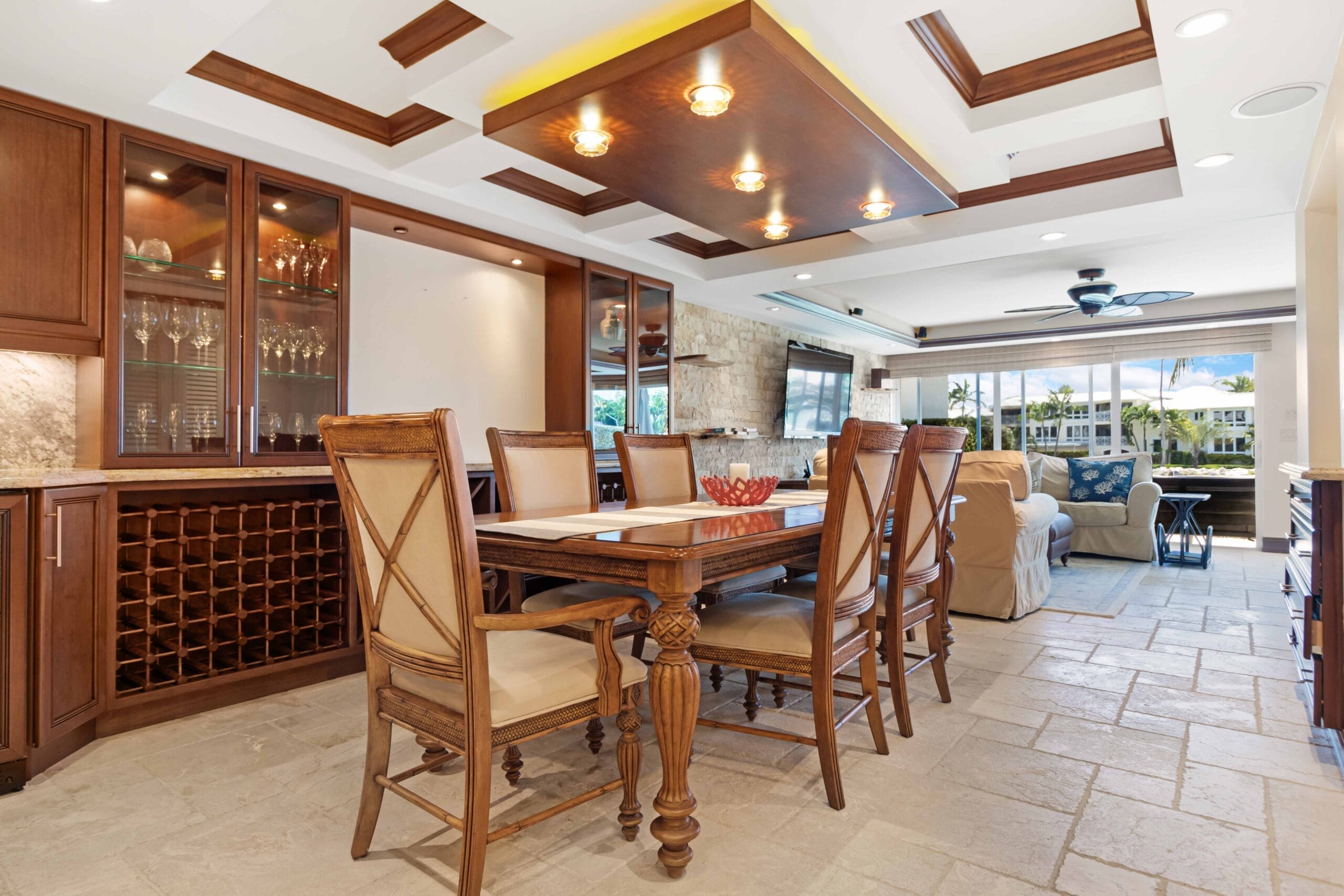 Flowing from the living room is a bar area with TV